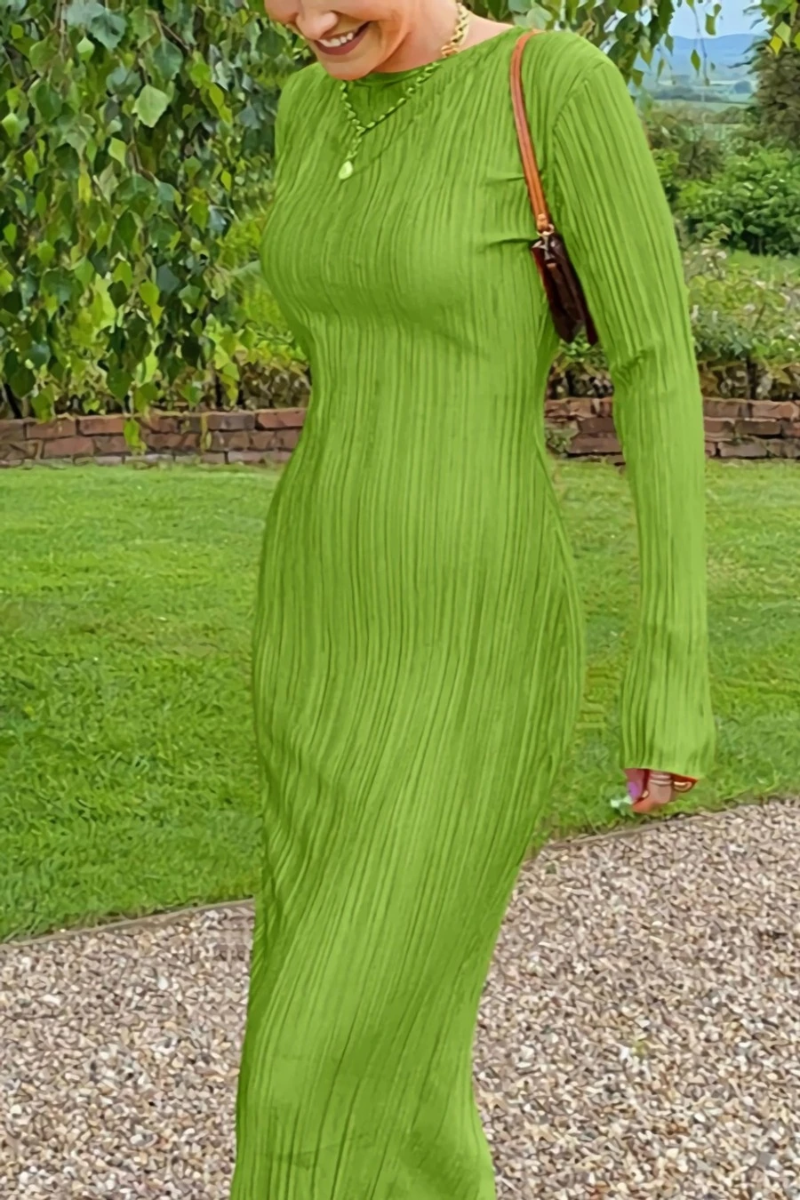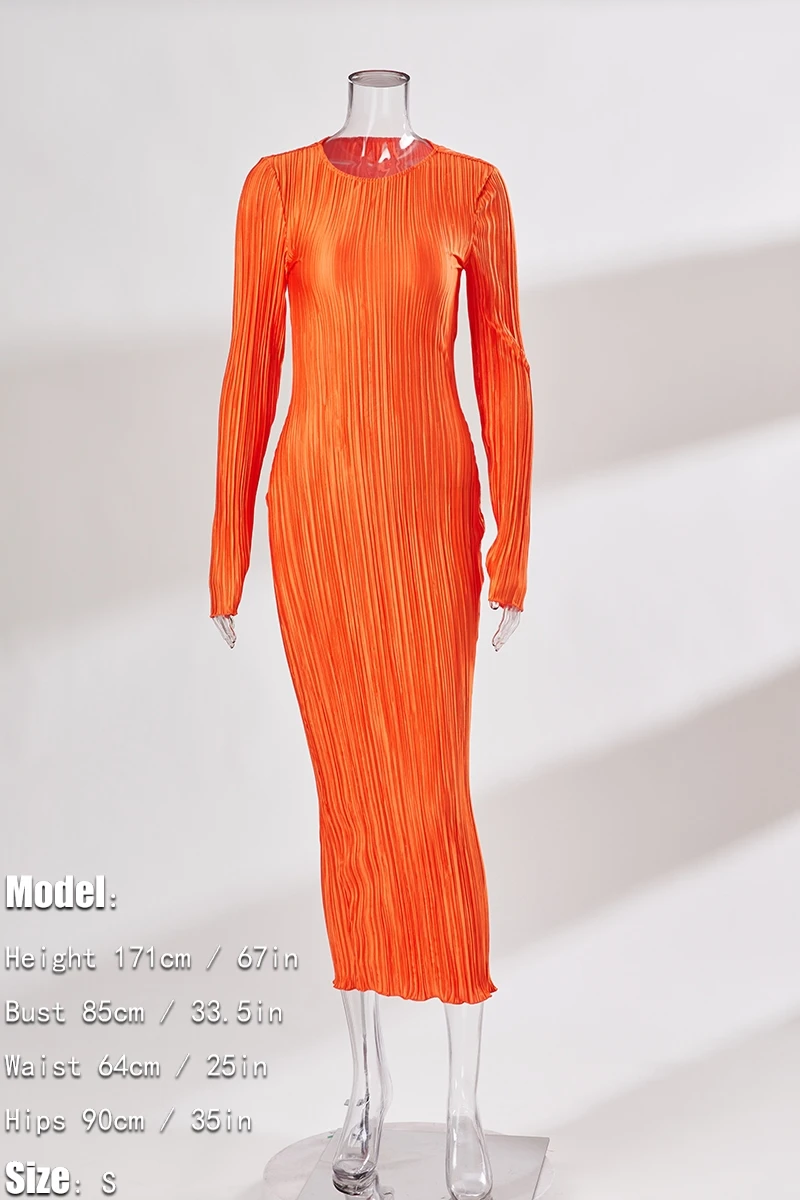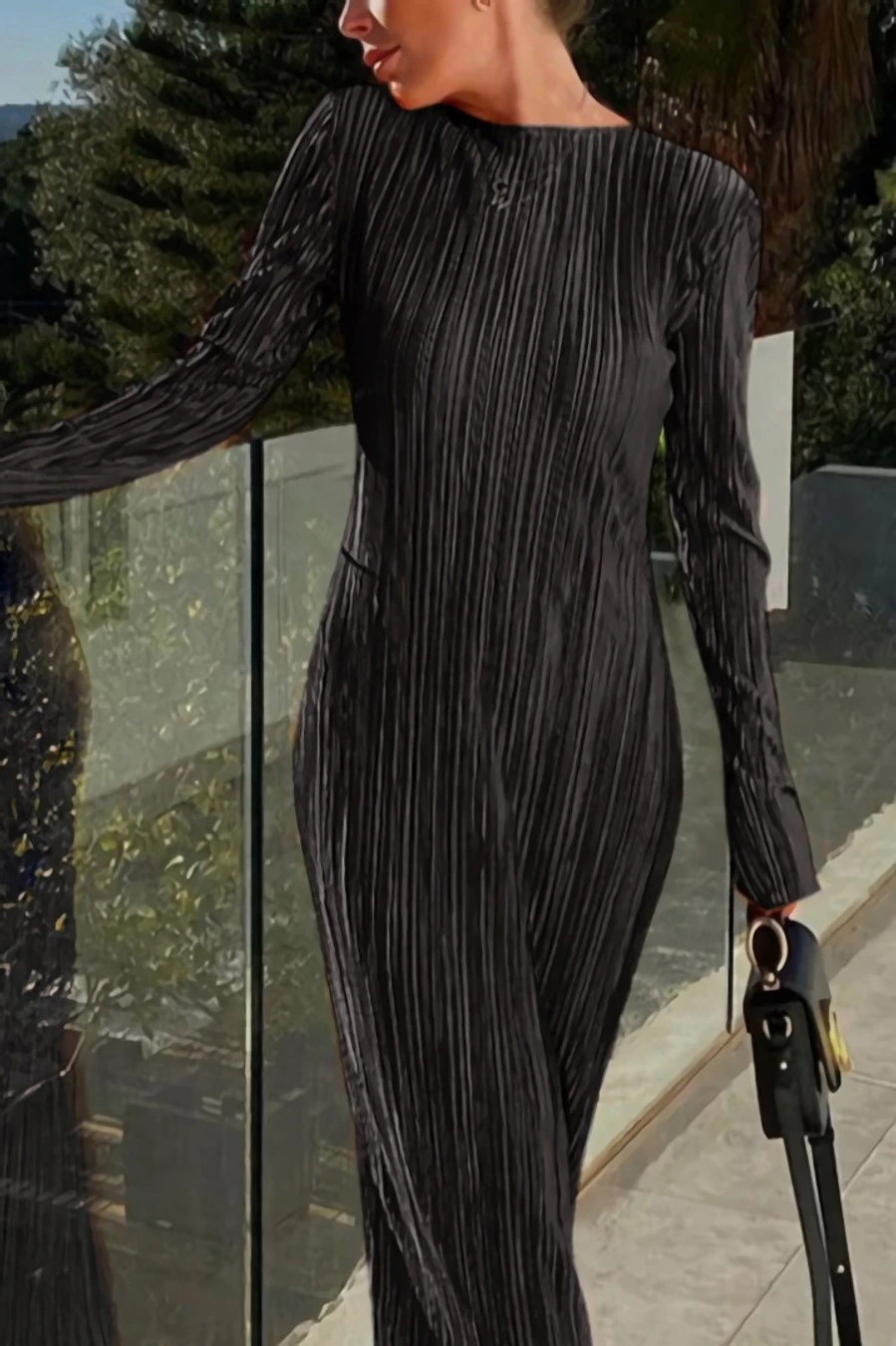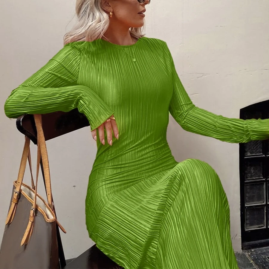 Autumn new 3 colors slight stretch long sleeve pleated stylish casual slim midi dress