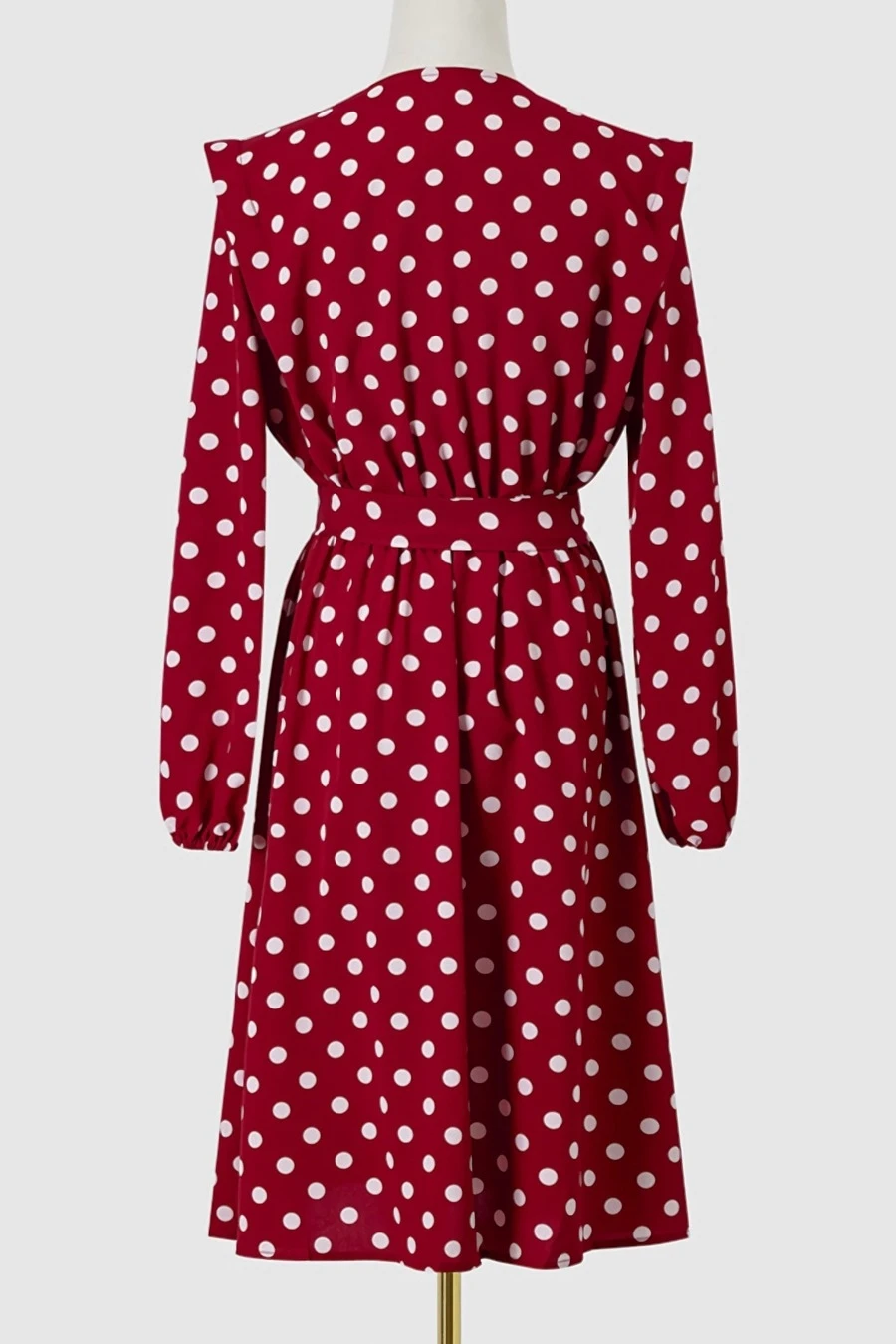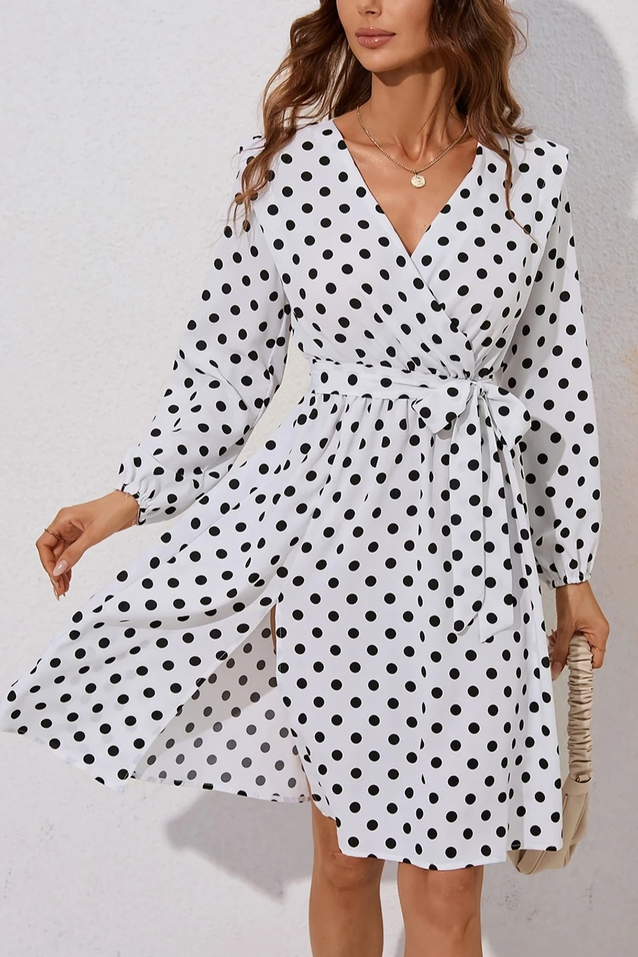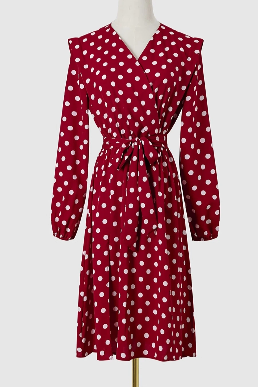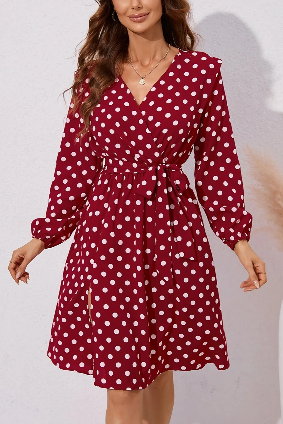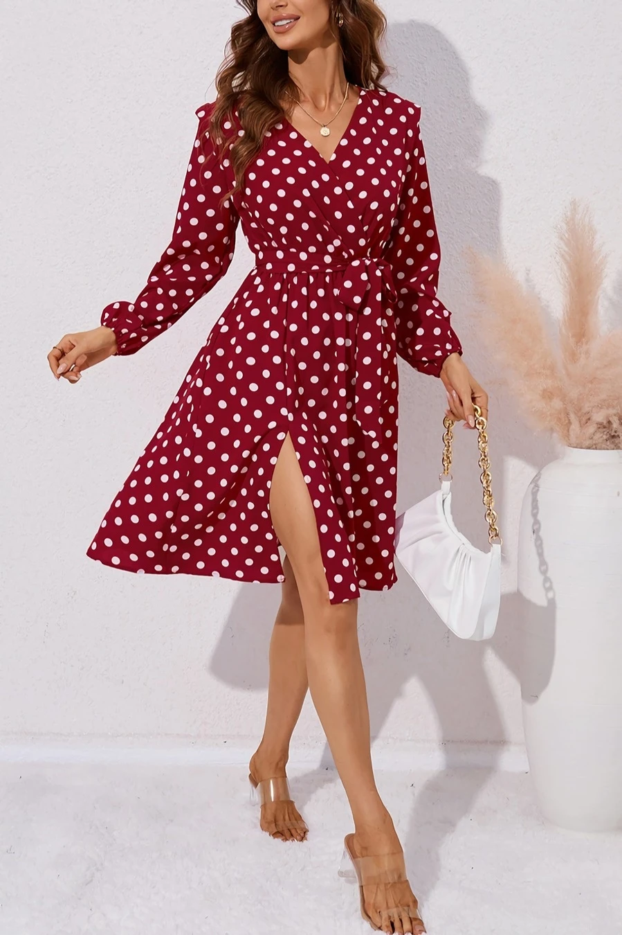 Autumn new plus size 2 colors polka dot batch printing slight stretch long sleeve v-neck lace up slit stylish casual midi dress (with belt)
