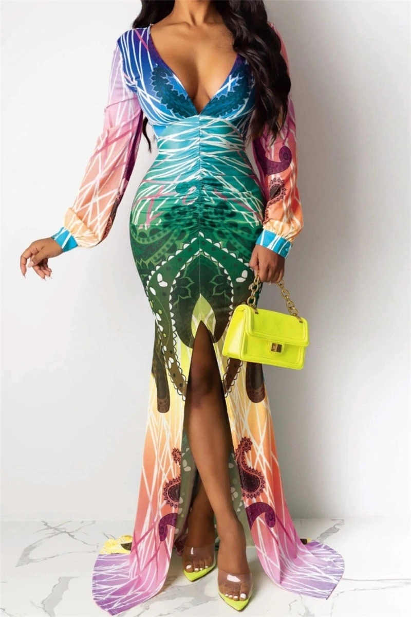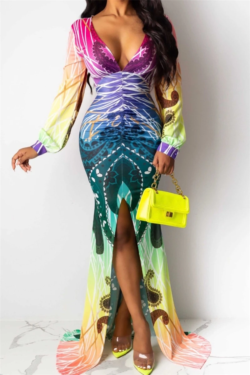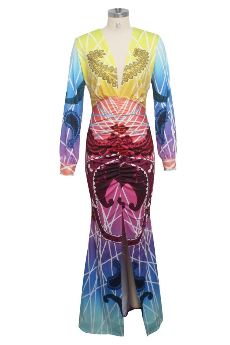 Autumn new plus size four colors digital print V-neck slit elegant length the floor dress