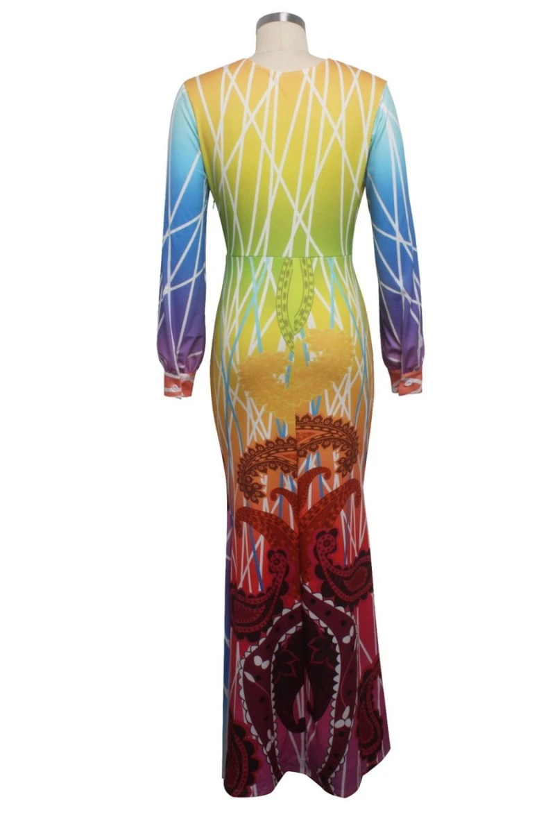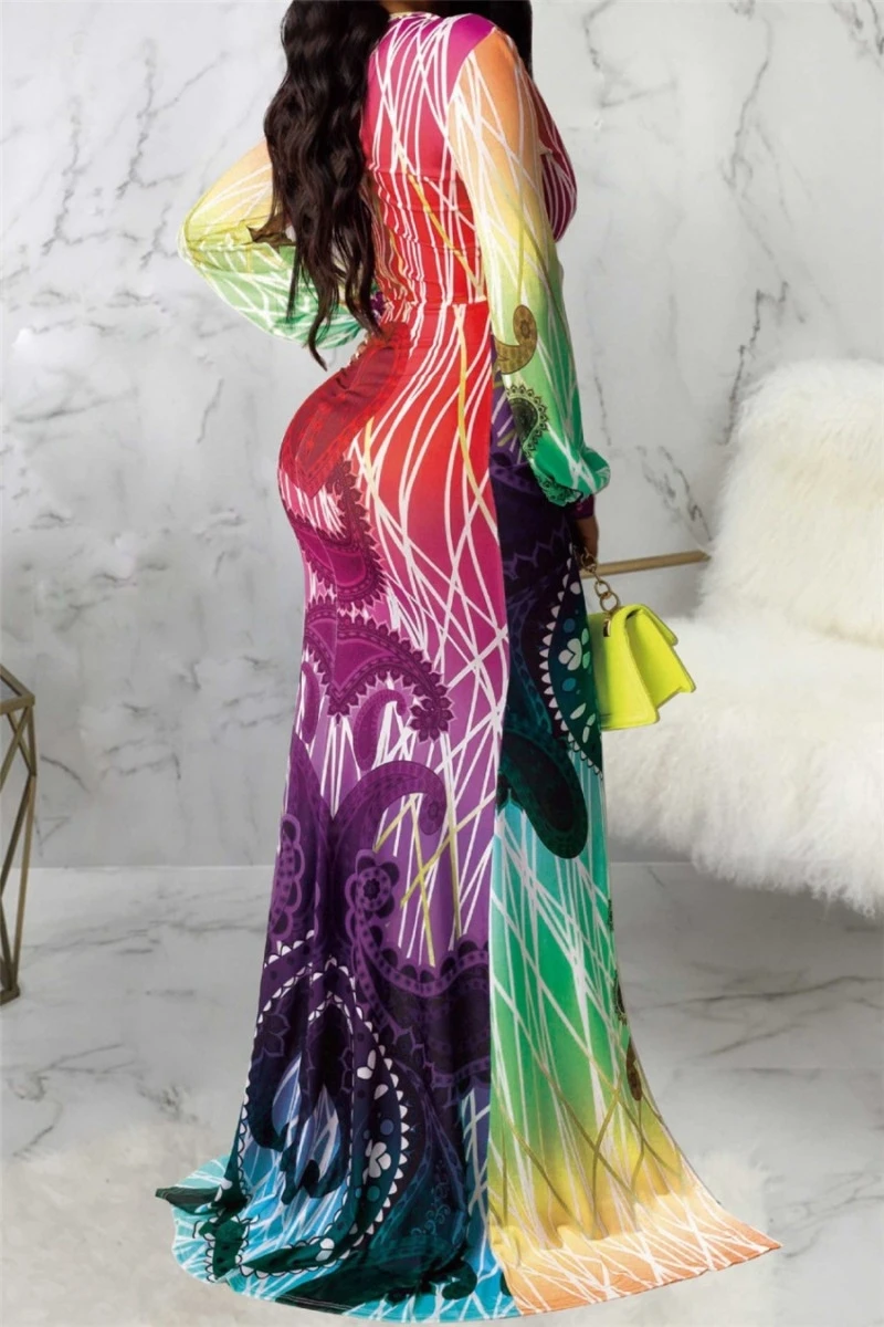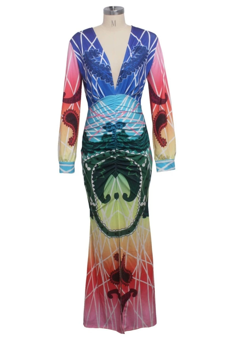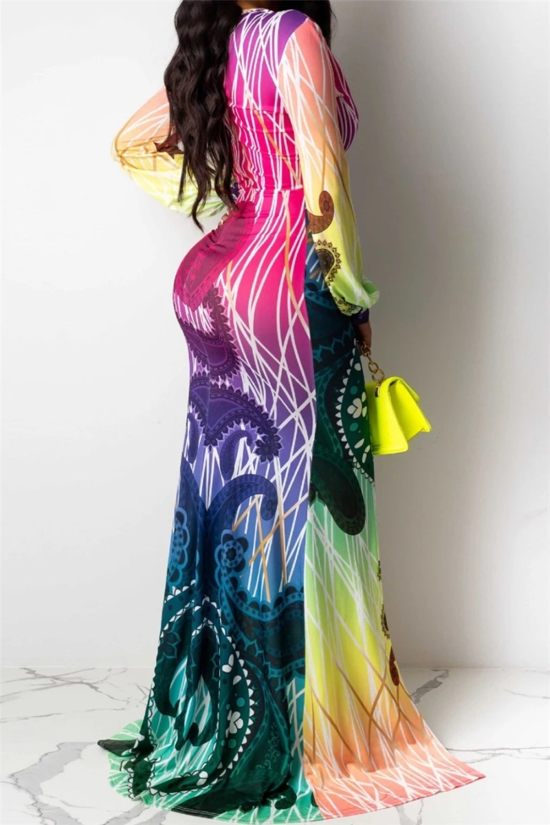 Autumn new plus size four colors digital print V-neck slit elegant length the floor dress