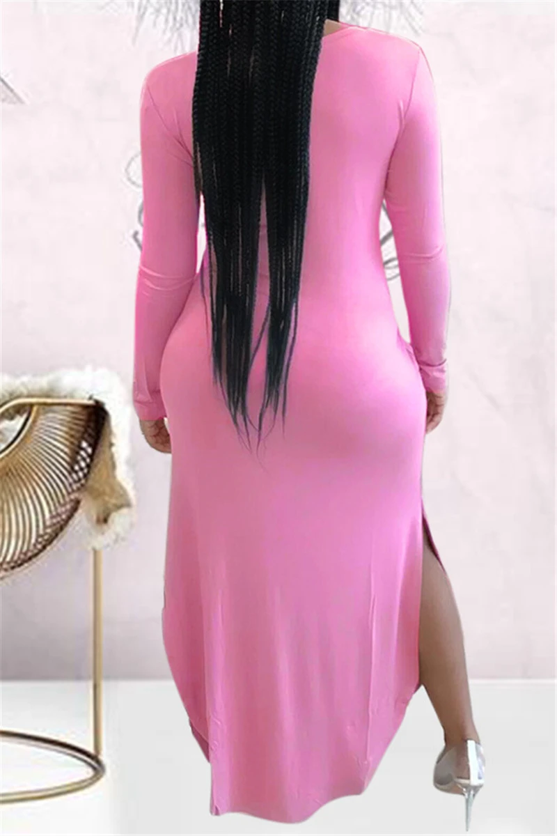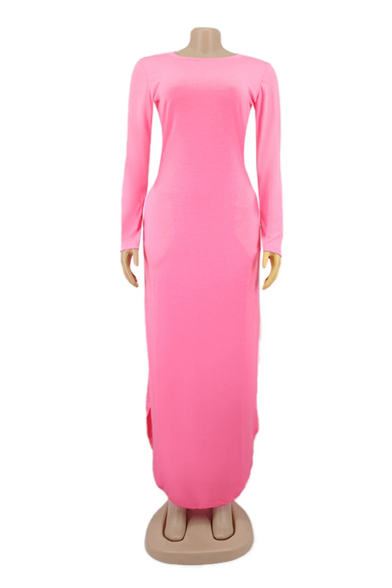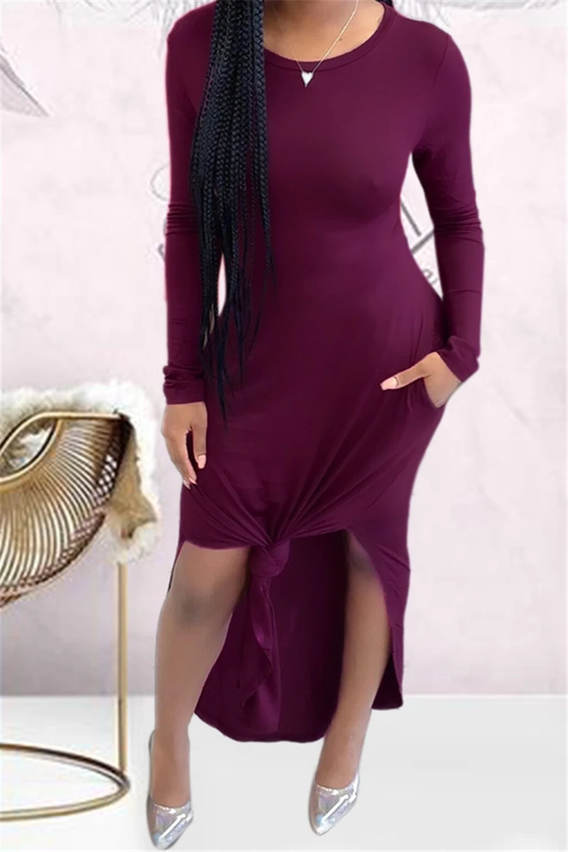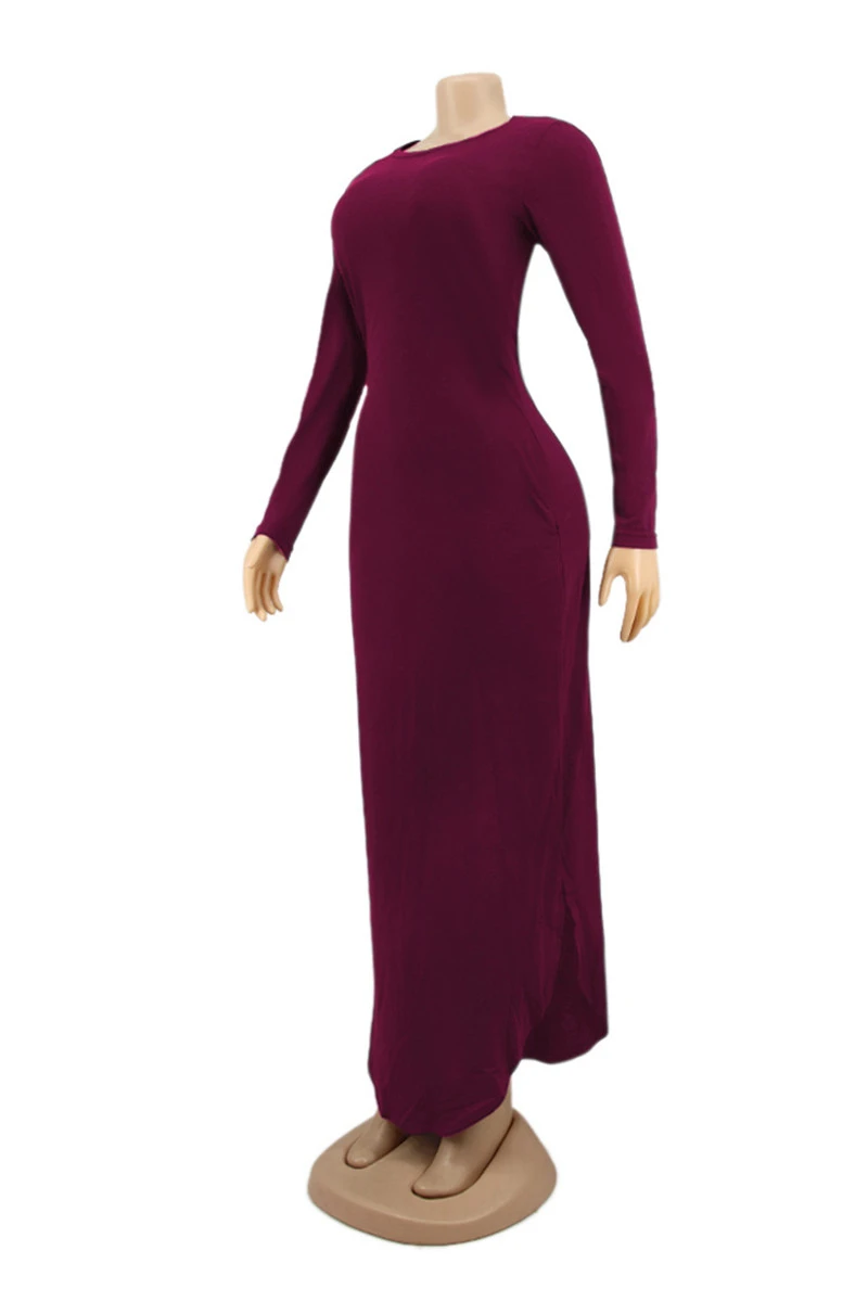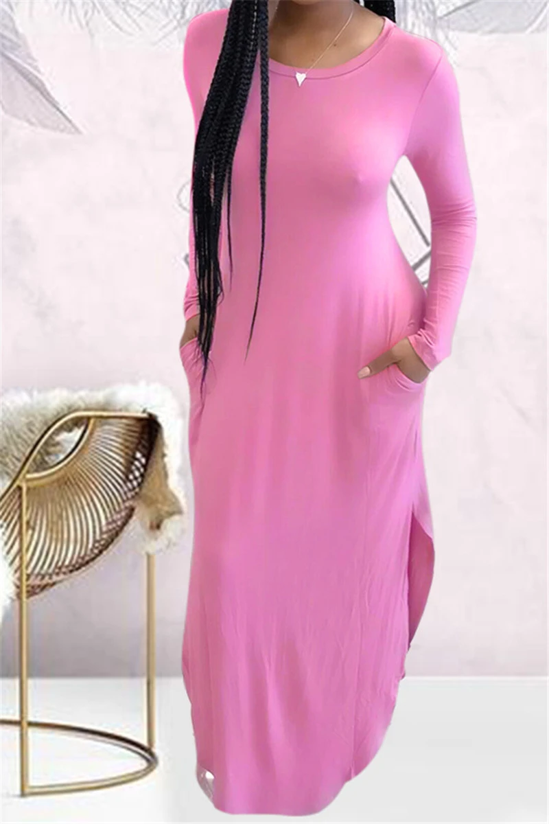 Autumn new plus size solid color stretch round-neck side slit pockets stylish dress