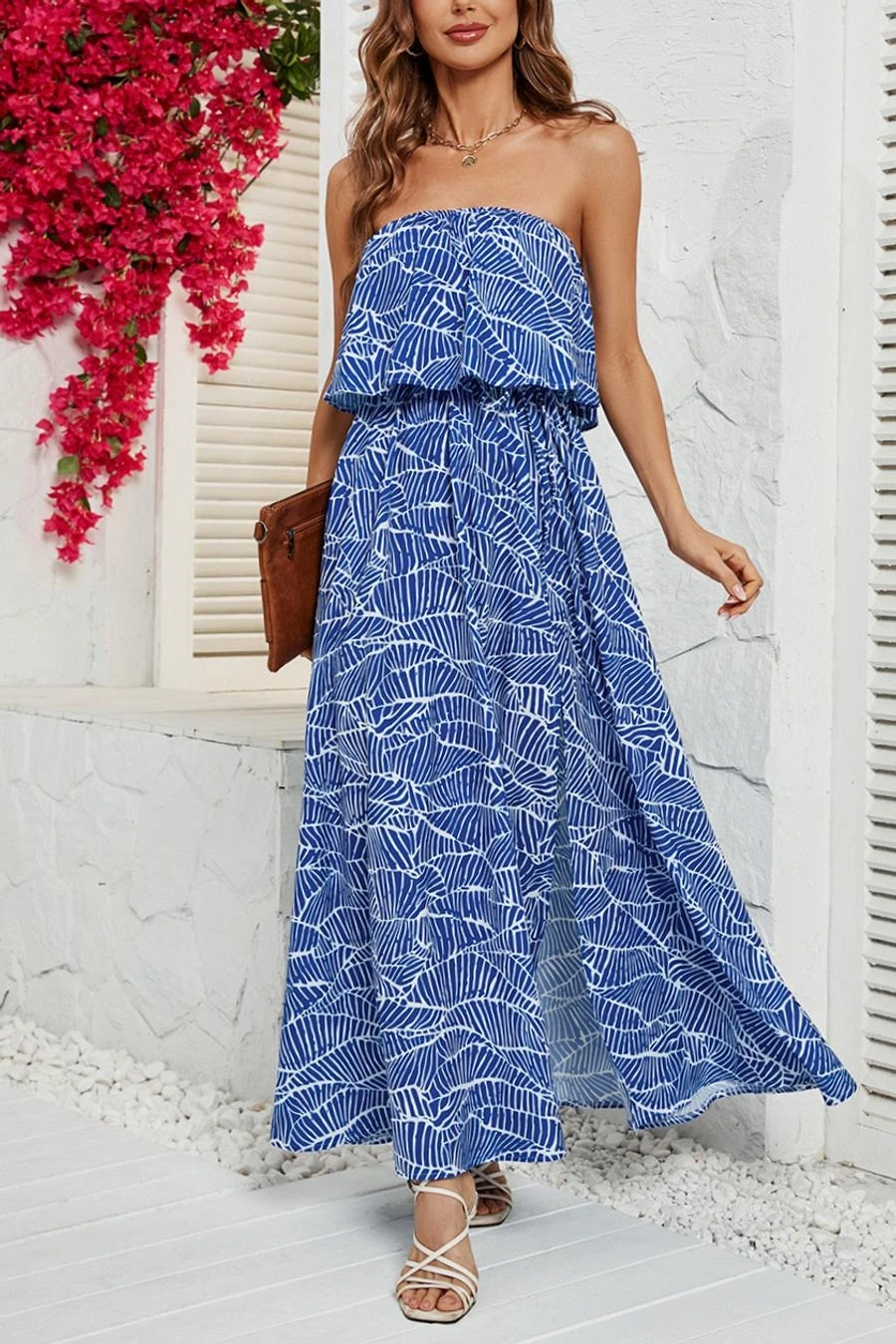 Bohemian non-stretch batch printing tube design ruffle high split maxi dress