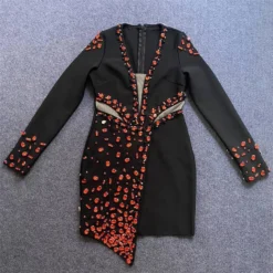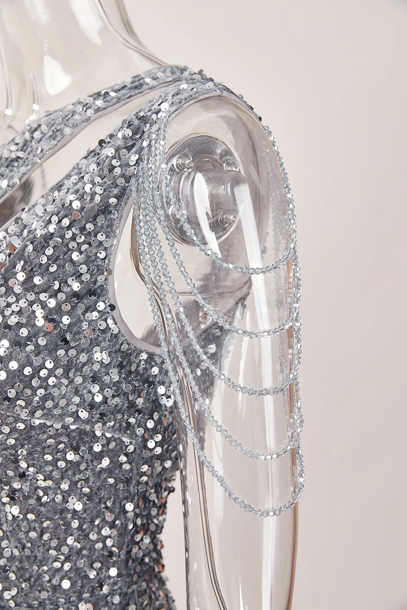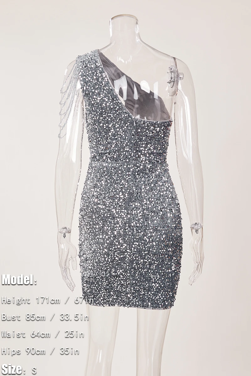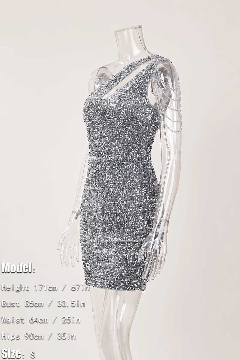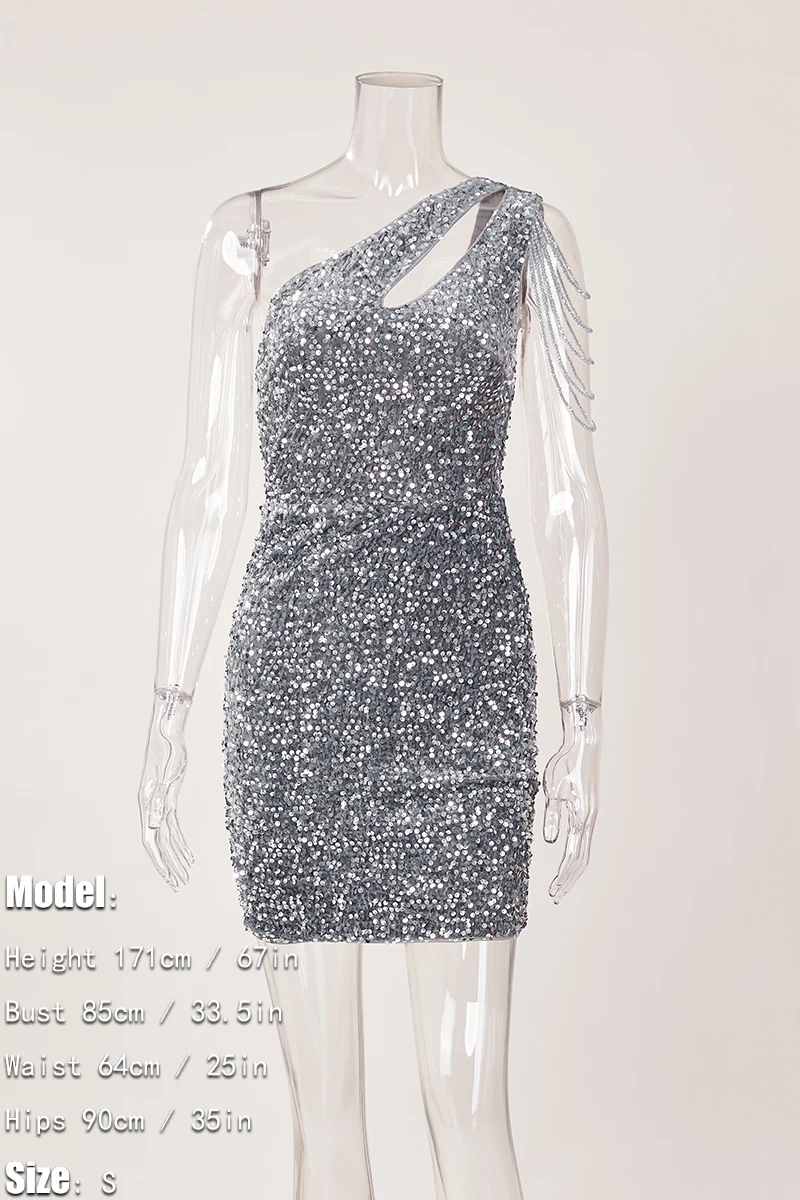 Elegance extra small inelastic sequin chain decor one shoulder hollow mini dress