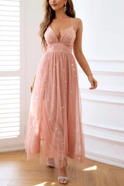 Elegant High Quality Slight Stretch Sequin Padded Mesh Ribbon Maxi Dress Wholesale