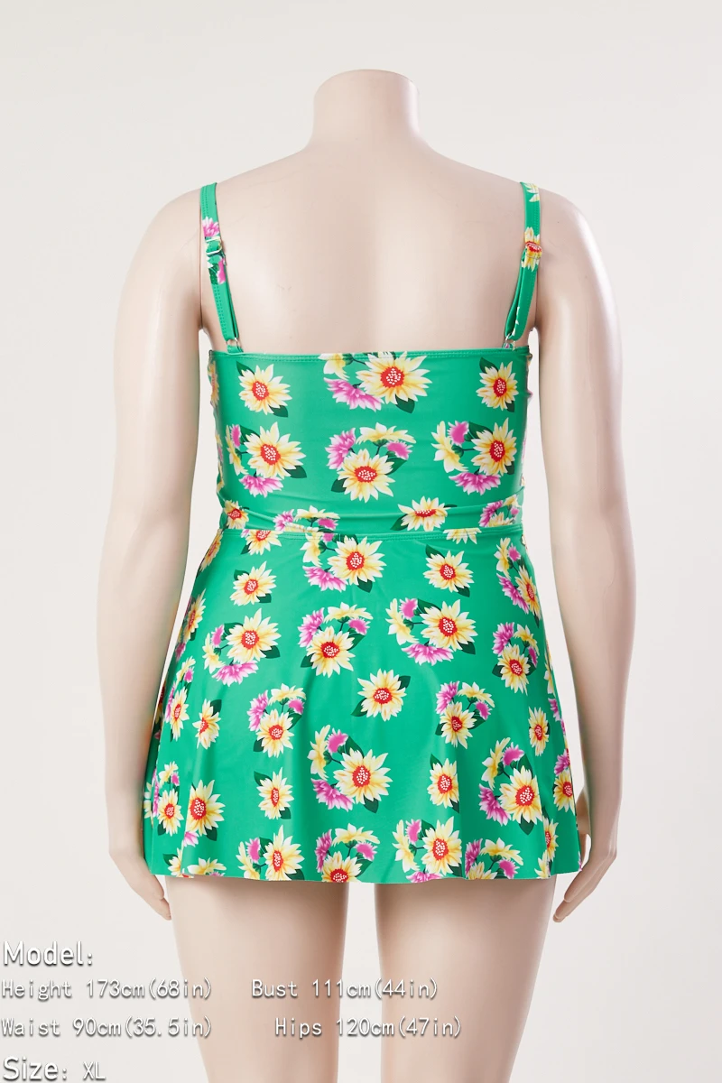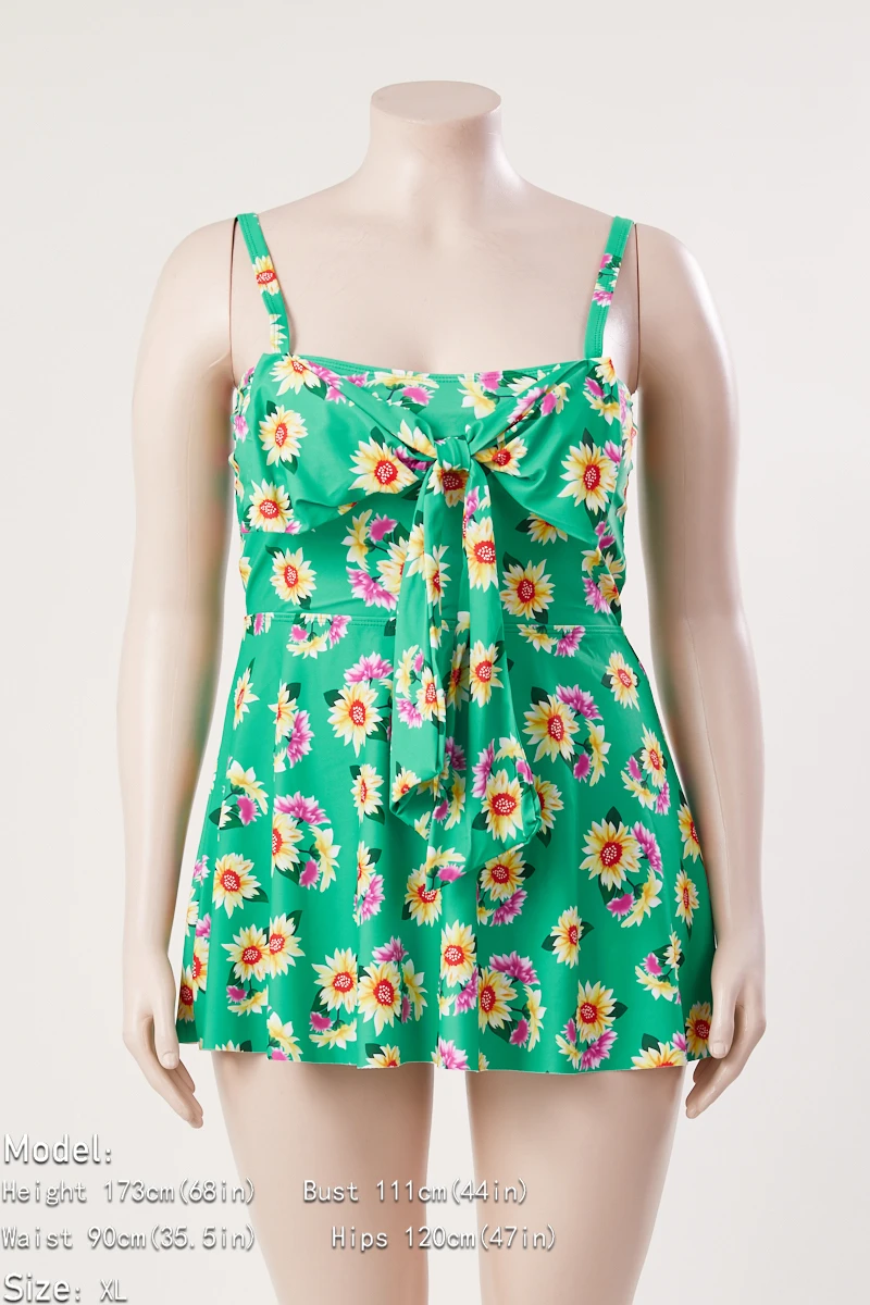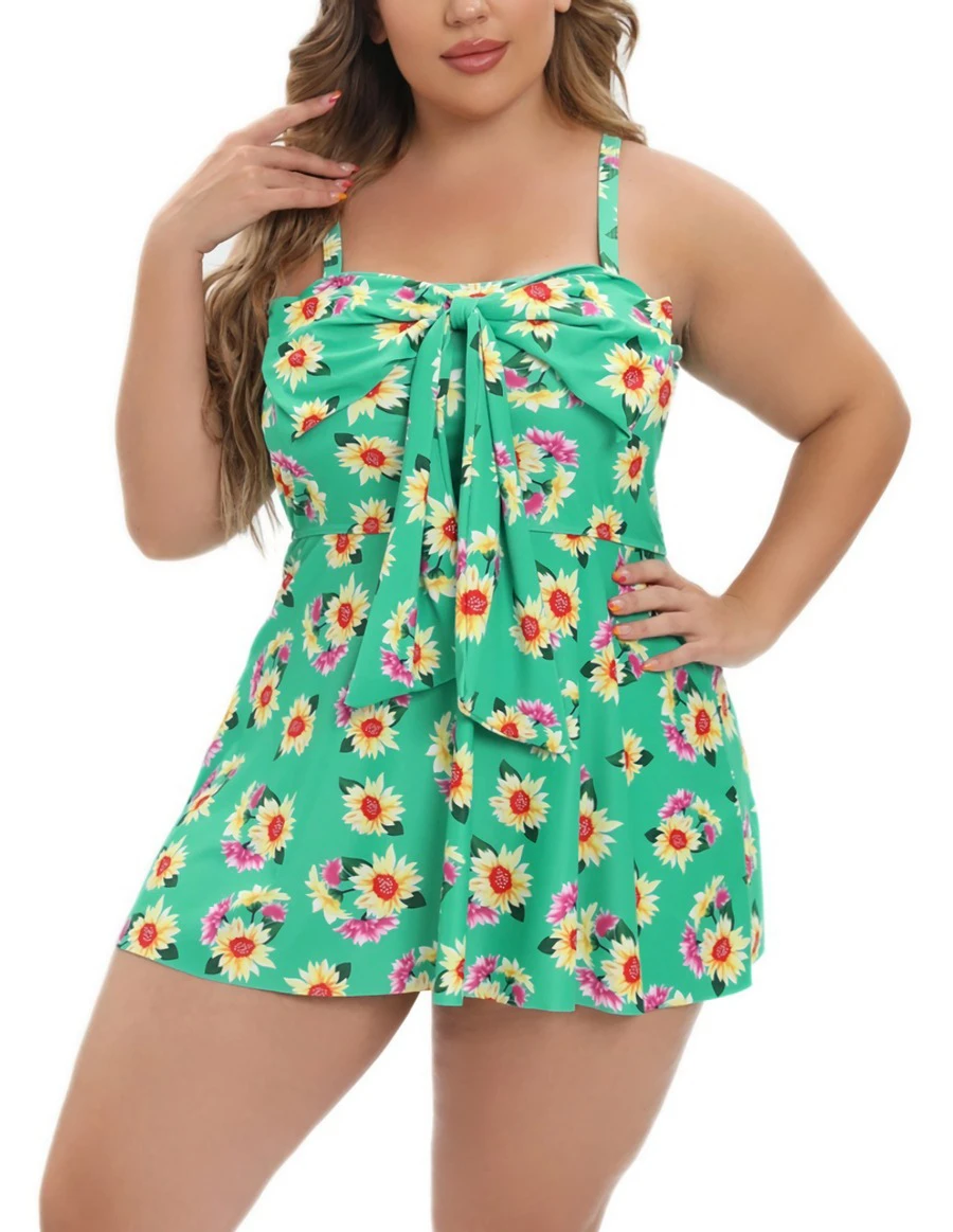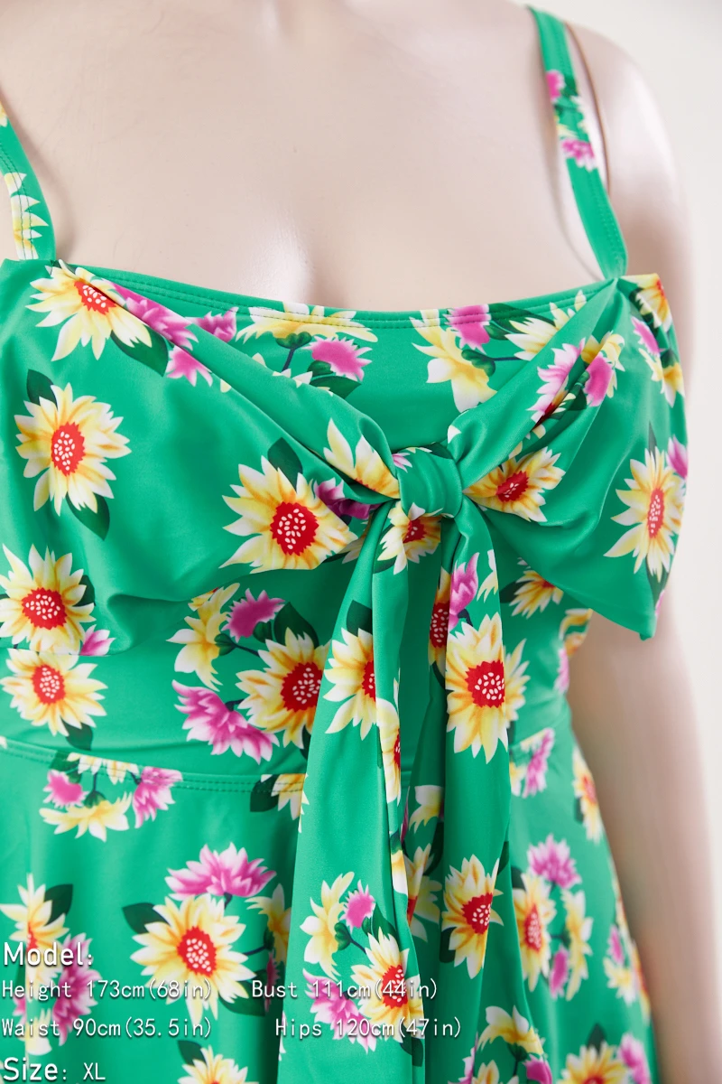 Plus size daisy leaf printing padded bow-knot dress style sweet tankini set