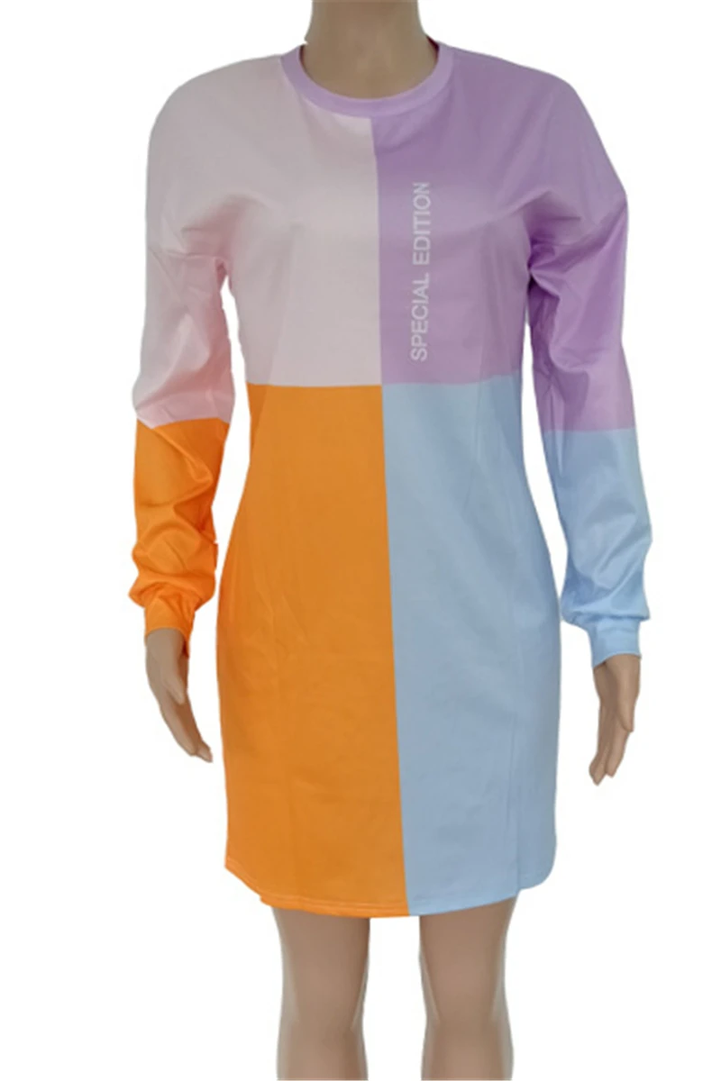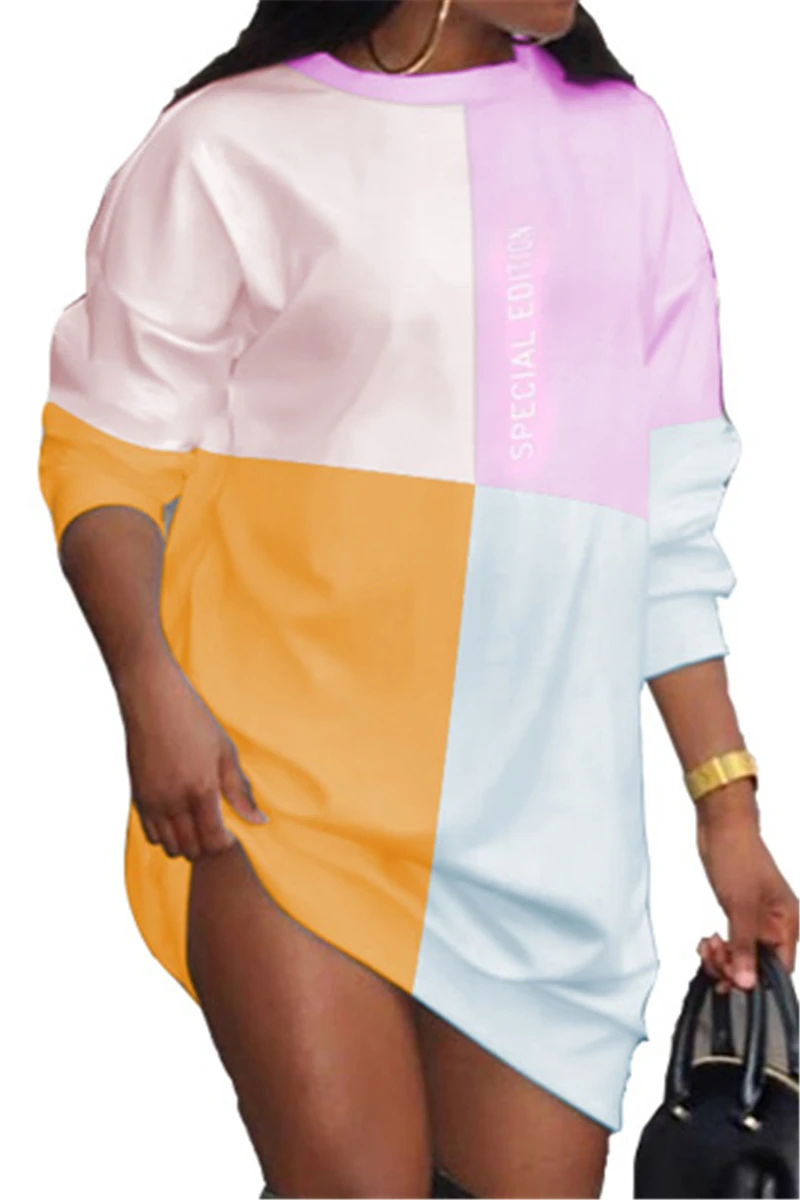 Plus size new stylish letters printing autumn contrast color stretch loose dress