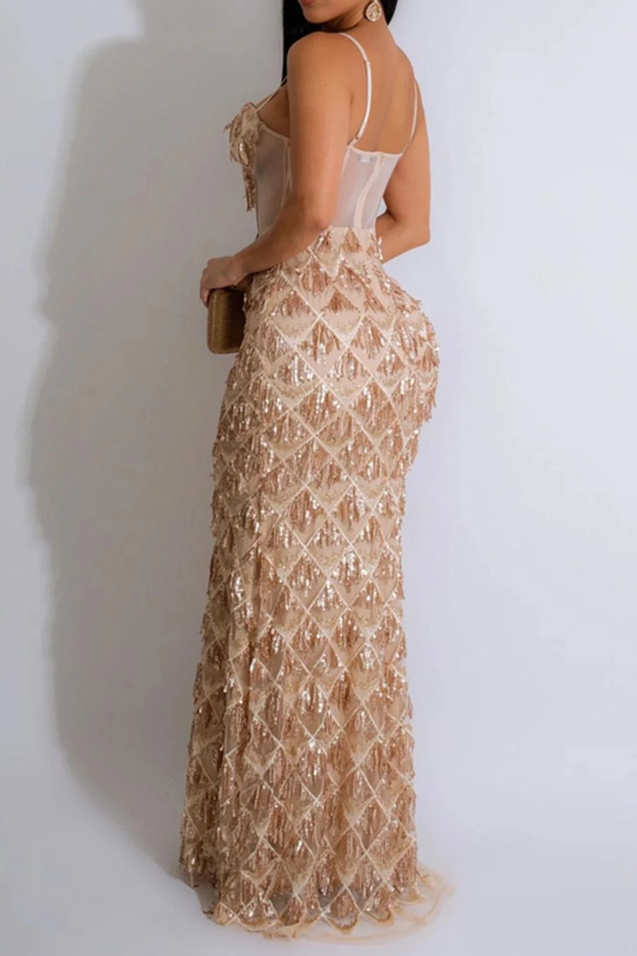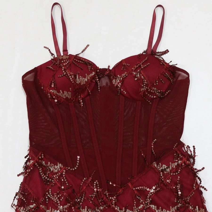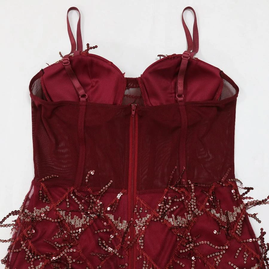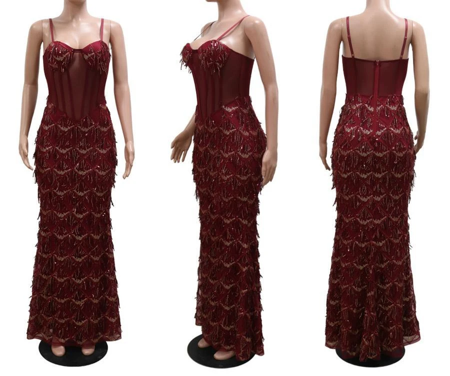 Sexy plus size slight stretch padded mesh sequins tassel sling maxi dress