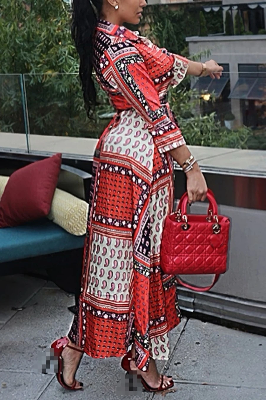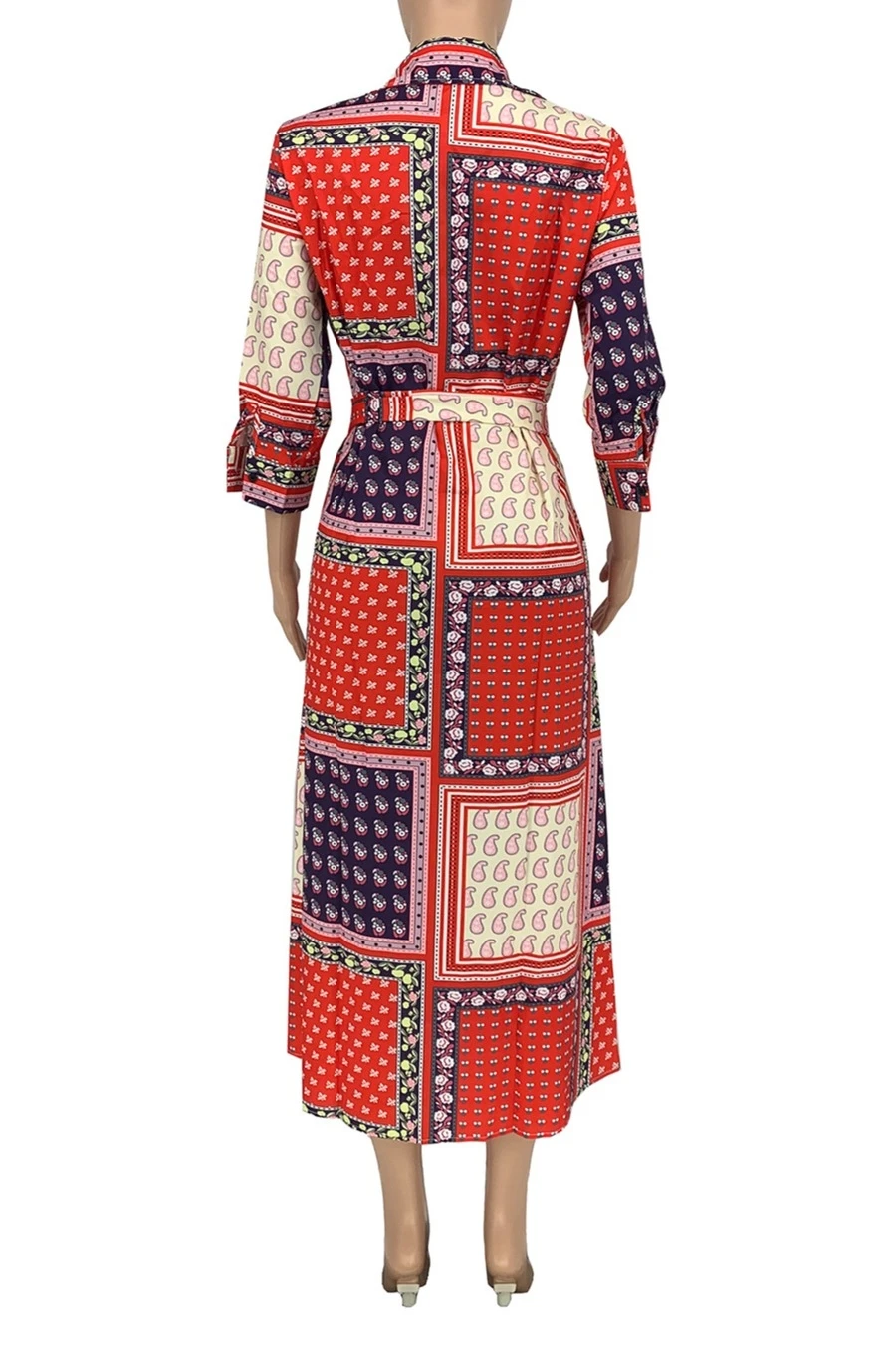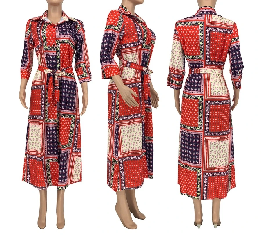 Spring new stylish batch printing single breasted micro elastic plus size casual maxi dress(with belt)