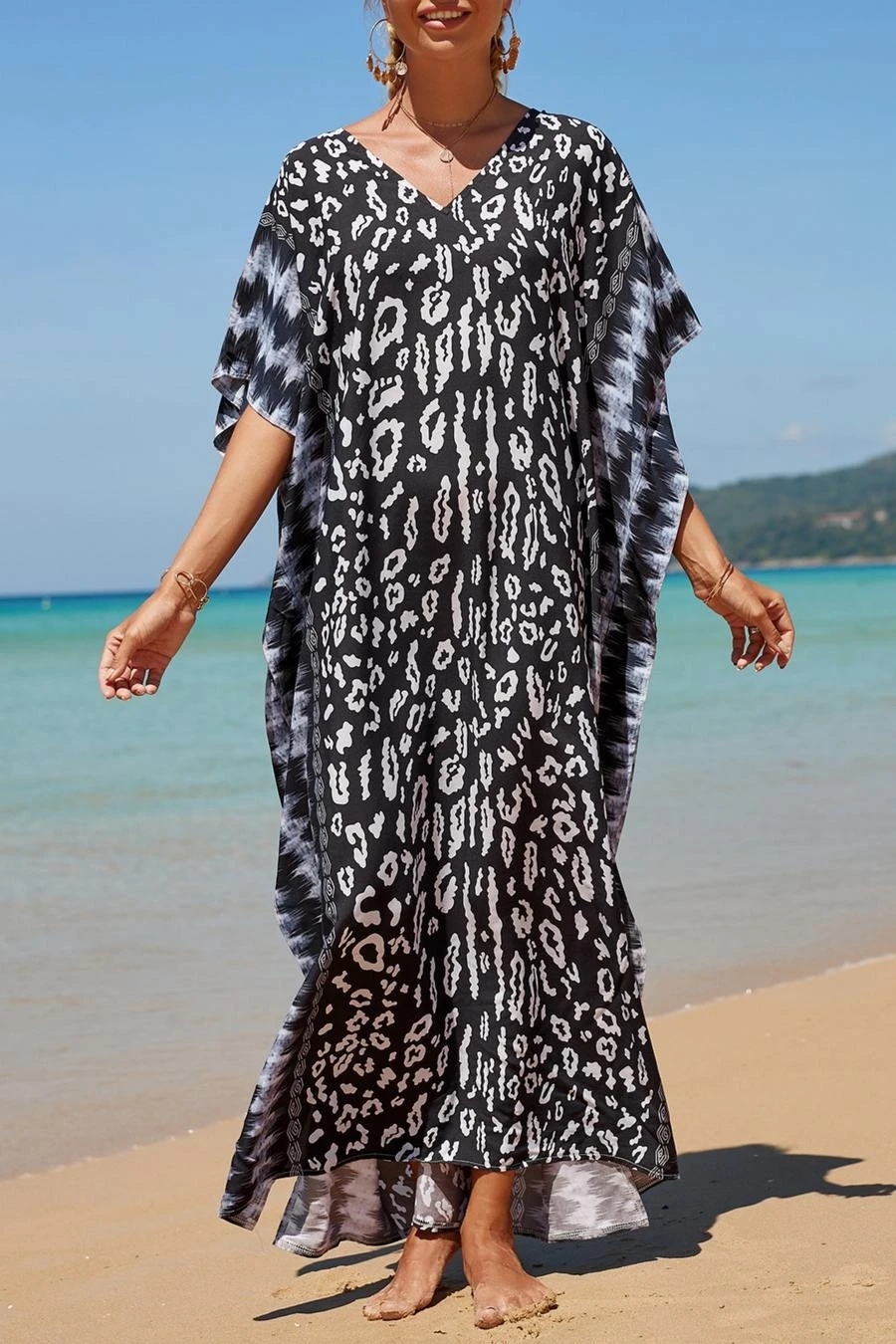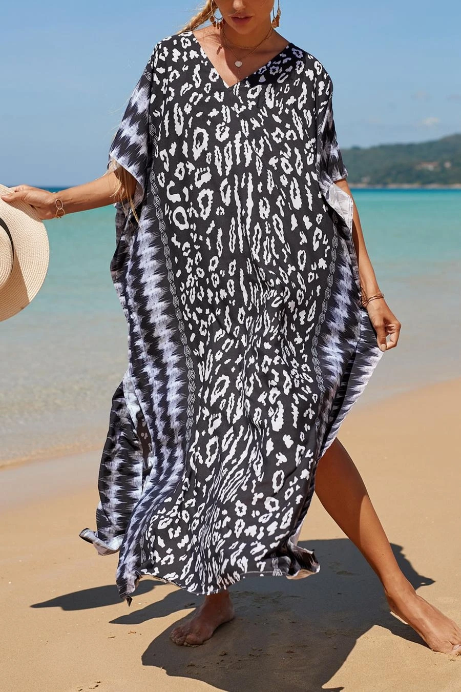 Stylish digital printing v-neck high-slit loose beach dress cover-up