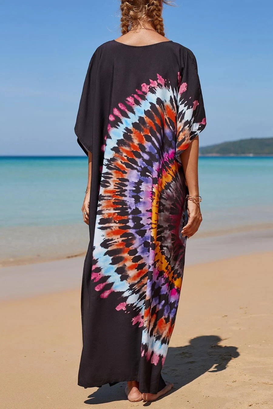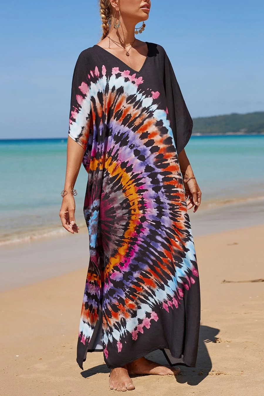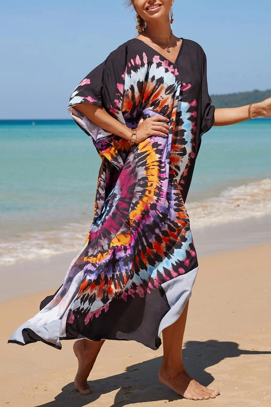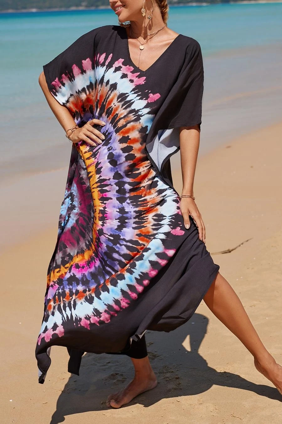 Stylish fixed printing v-neck high-slit loose beach dress cover-up