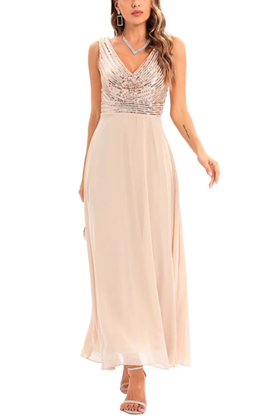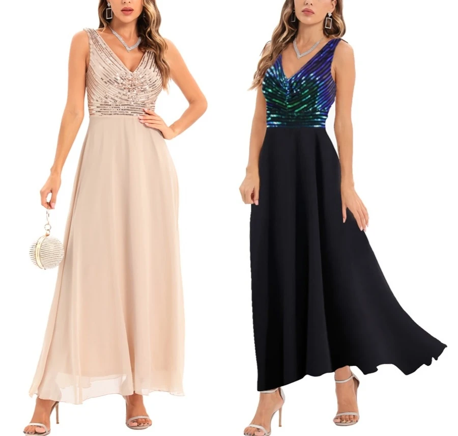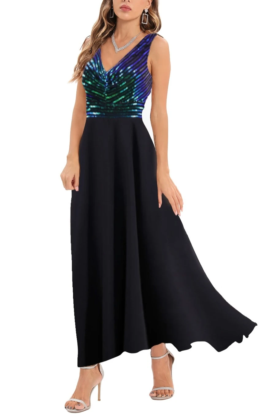 Summer new 2 colors sequin mesh patchwork stretch sleeveless v-neck swing stylish elegant maxi dress(with lining)