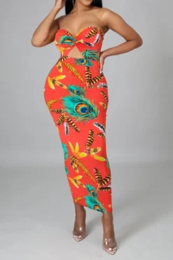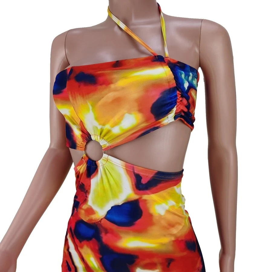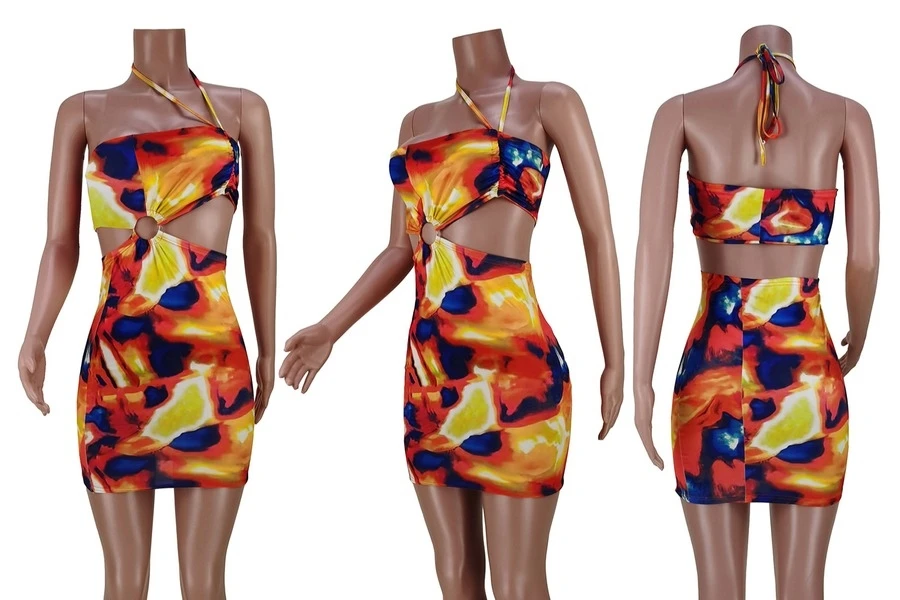 Summer new stylish tie dye batch printing stretch slim hollow halter neck backless sexy mini dress