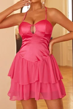 XS-L Sexy Non-stretch Satin Chiffon Stitching Padded Halter-neck Mini Dress Wholesale