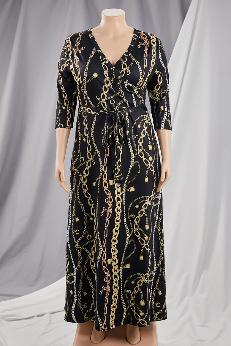 XL-5XL autumn new chain printing stretch V-neck three-quarter-sleeve loose stylish maxi dress with belt