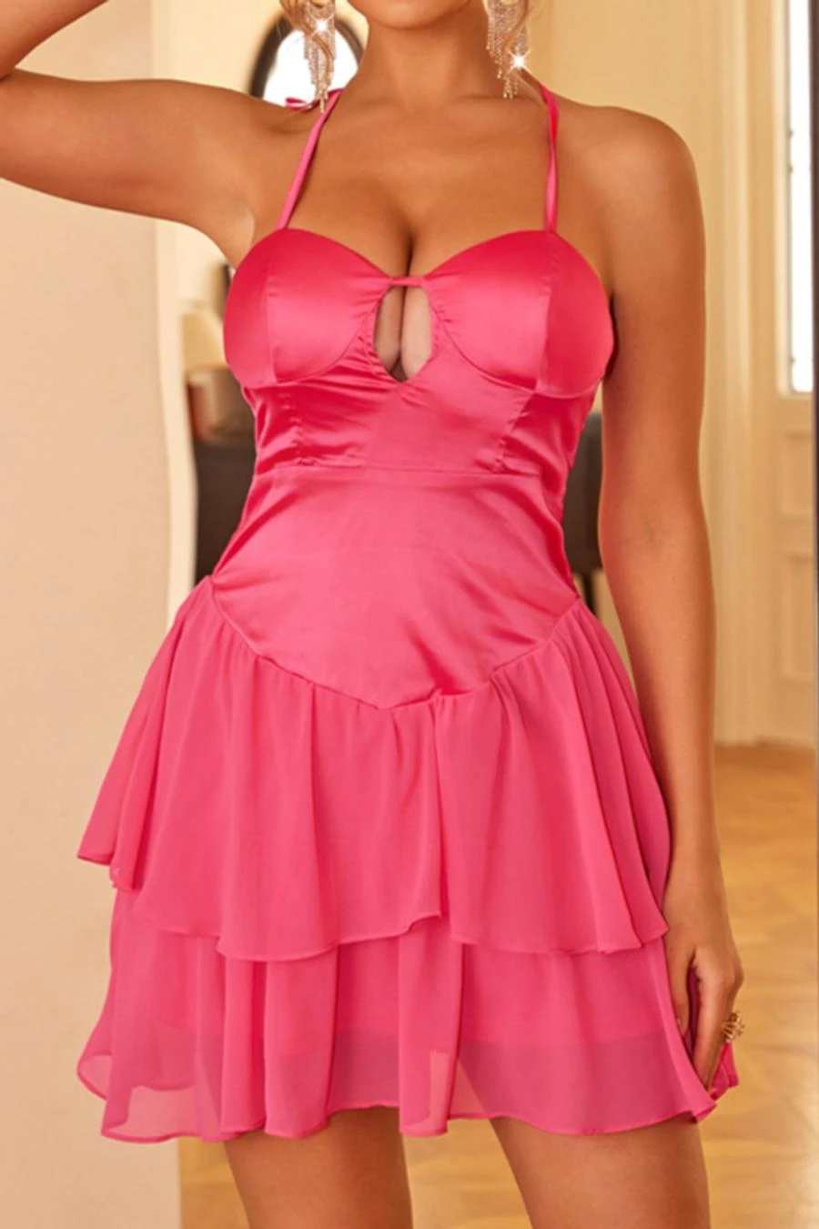 XS-L sexy non-stretch satin chiffon stitching padded halter-neck mini dress
